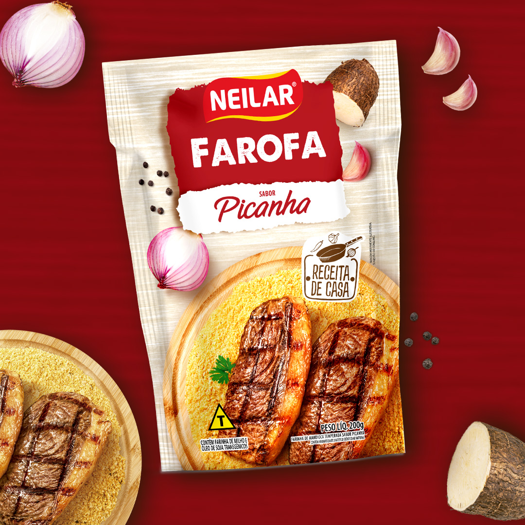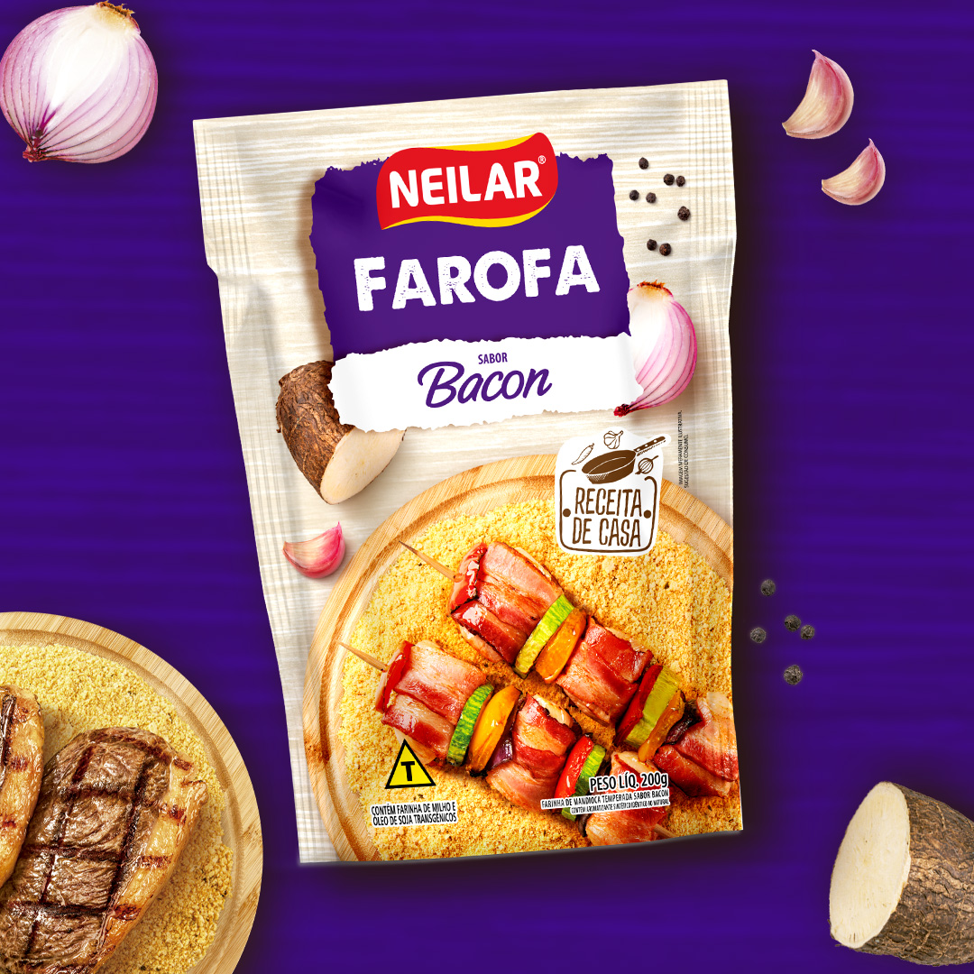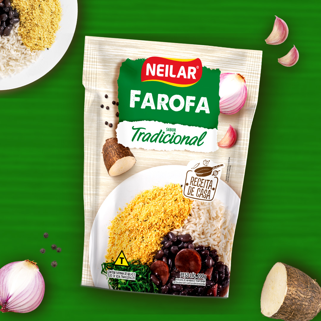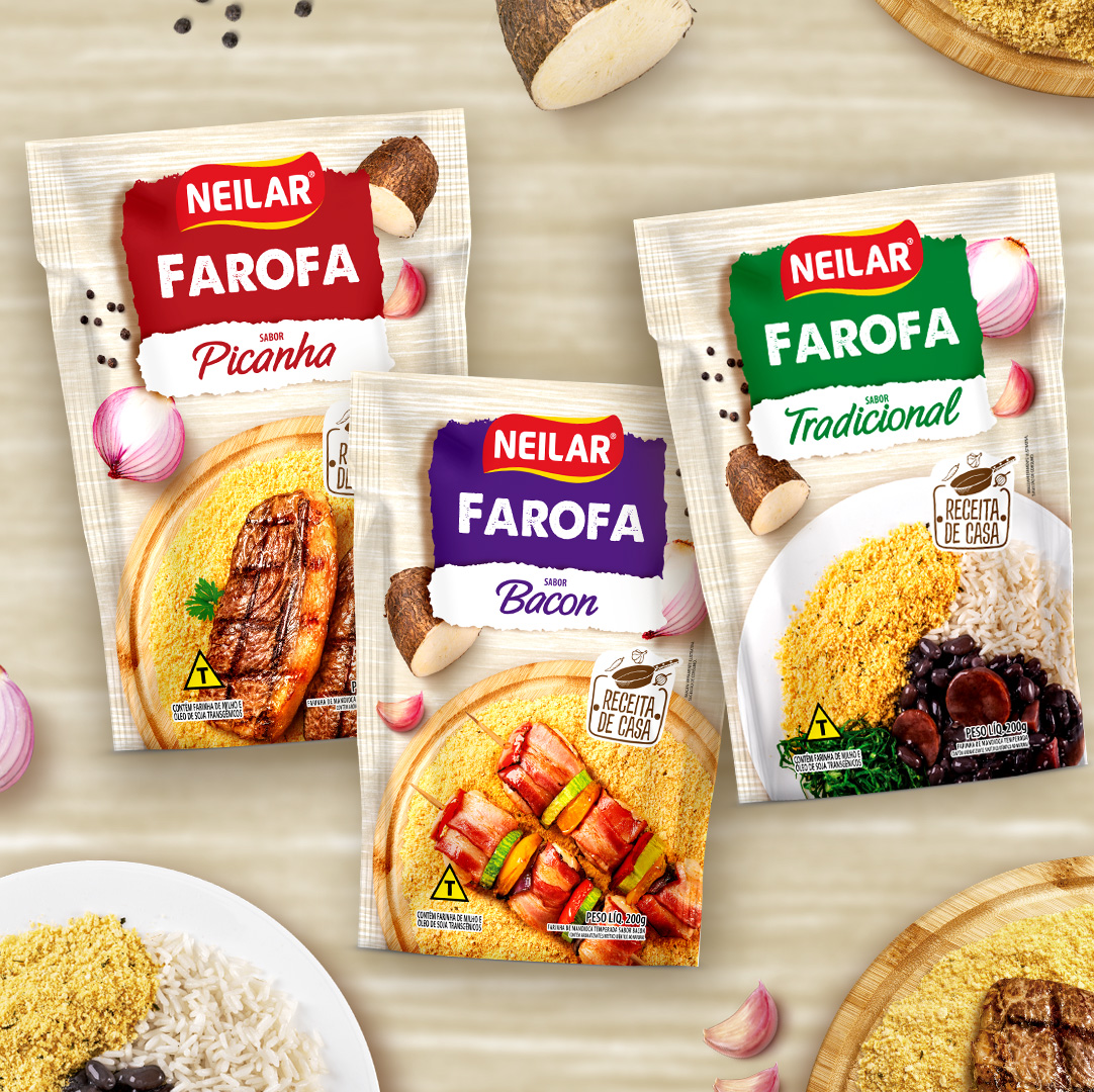 O design da linha de Farofas Neilar valoriza a tradição e o apelo caseiro, com paleta de cores distinta por sabor que facilita a identificação no ponto de venda e reforça variedade. As imagens de pratos prontos e ingredientes reais destacam textura, crocância e sabor, criando conexão direta com momentos de consumo cotidianos e refeições completas.