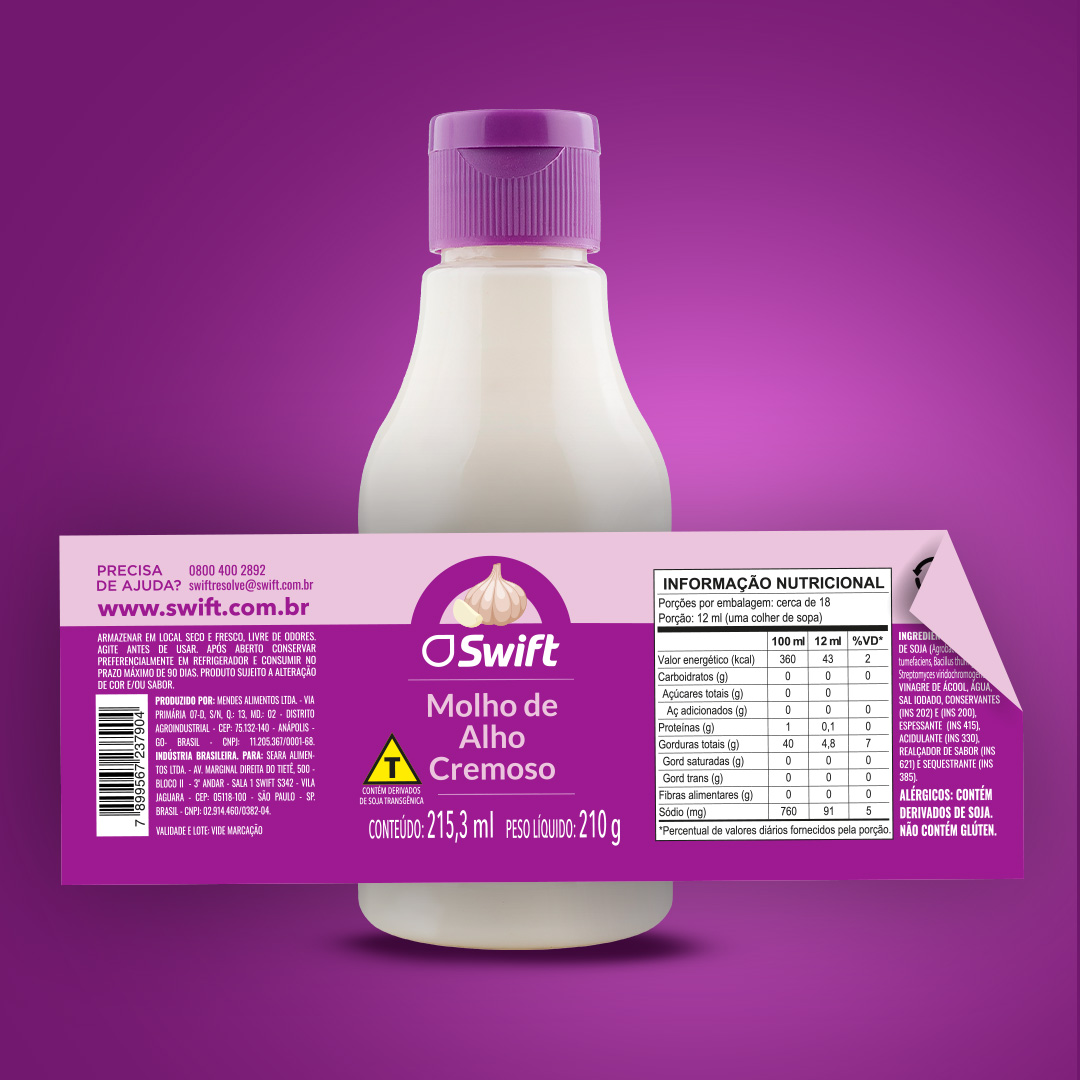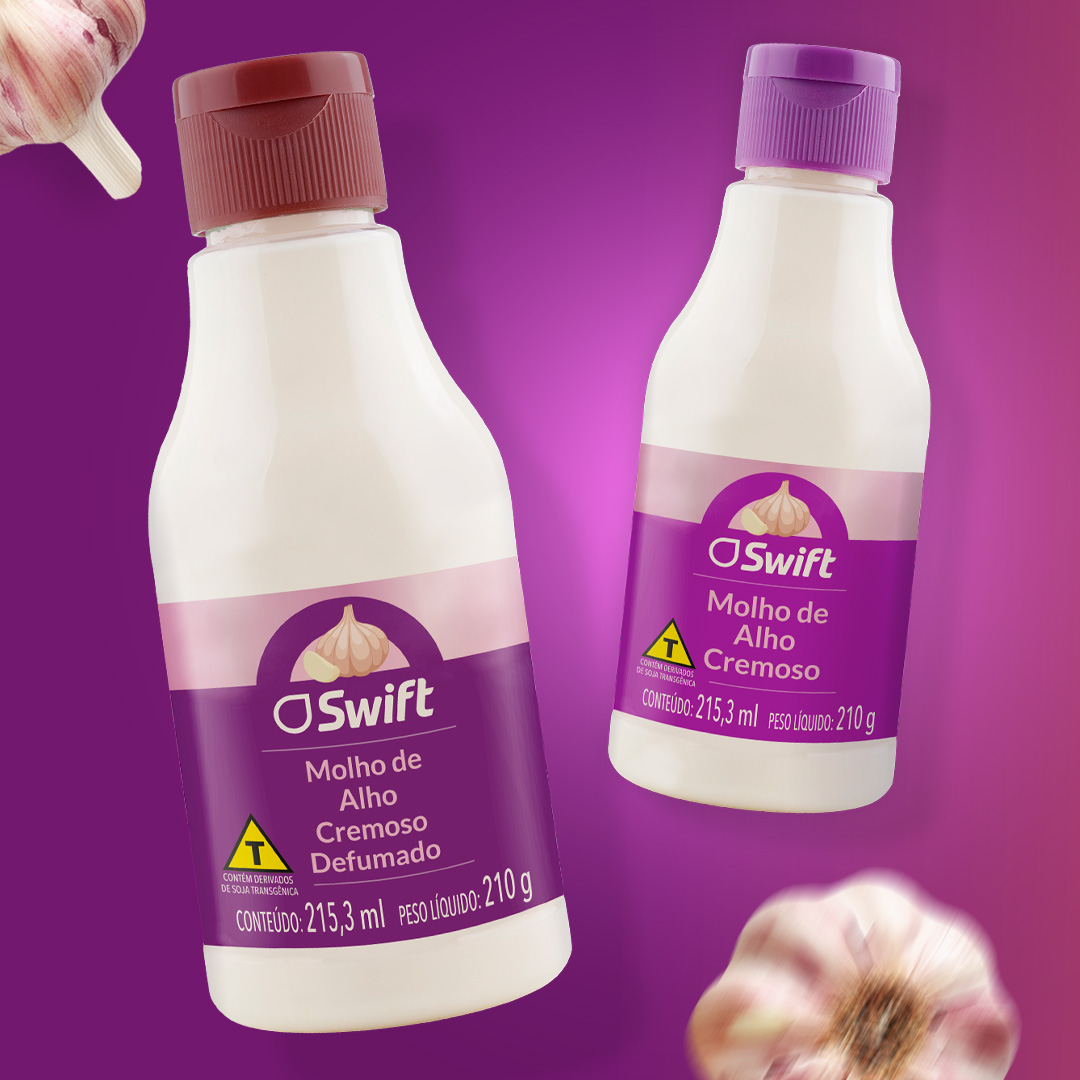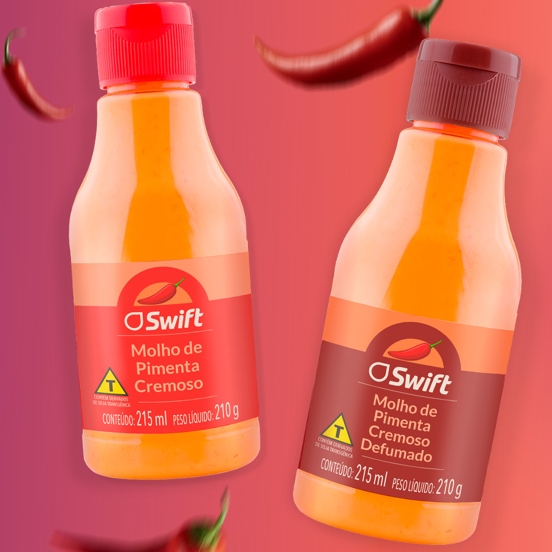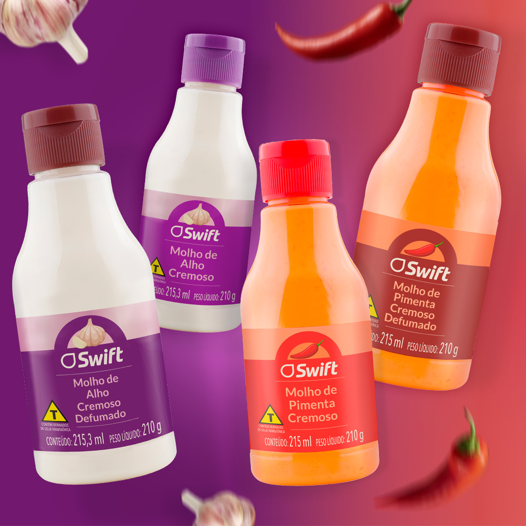 O design da linha de molhos Swift aposta em uma linguagem visual contemporânea e expressiva, utilizando cores intensas para diferenciar sabores e facilitar a identificação no ponto de venda. A hierarquia gráfica prioriza a marca e o nome do produto, garantindo leitura rápida, enquanto os rótulos envolventes acompanham o formato da embalagem e reforçam unidade visual em toda a linha.