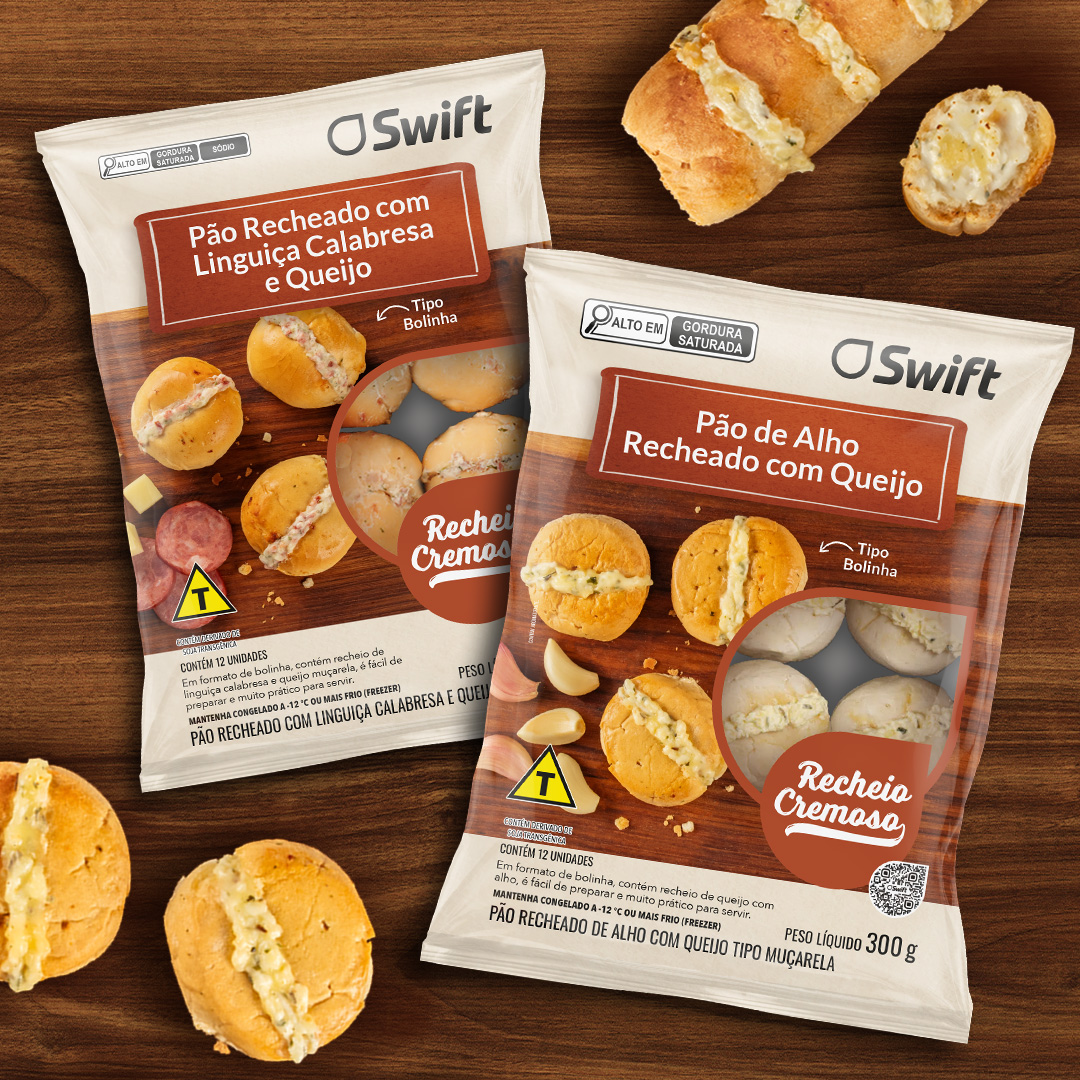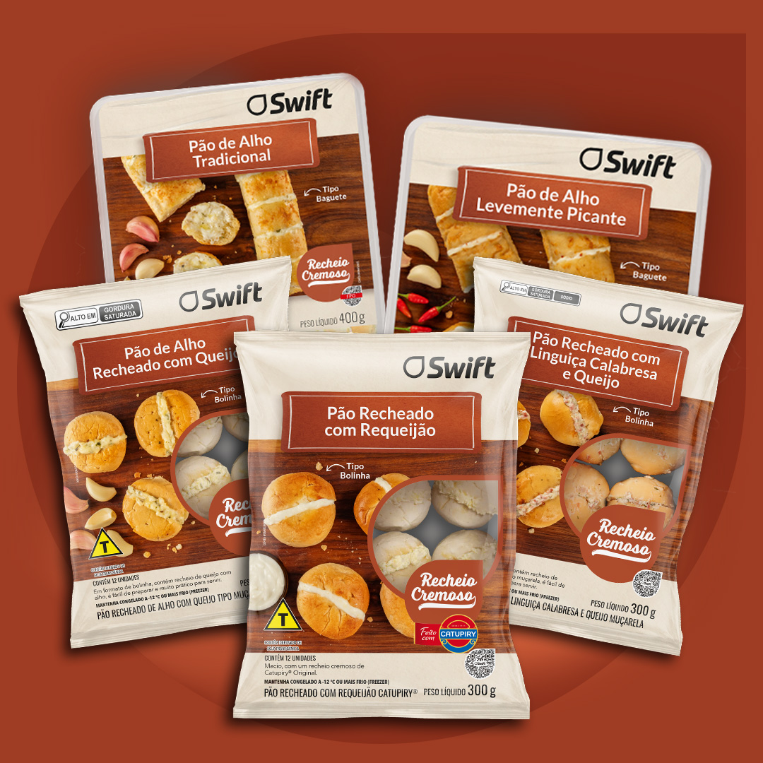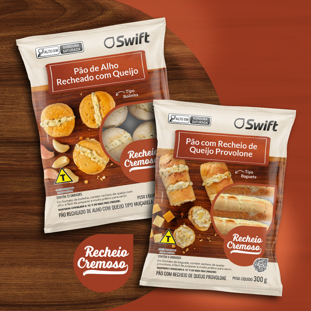 O design da linha de pães de alho e pães recheados Swift valoriza o apelo artesanal e o momento de consumo, utilizando uma paleta quente e imagens que evidenciam textura, recheio e cremosidade. A composição visual cria associação direta com preparo na churrasqueira e ocasiões de compartilhamento, reforçando sabor e indulgência.
