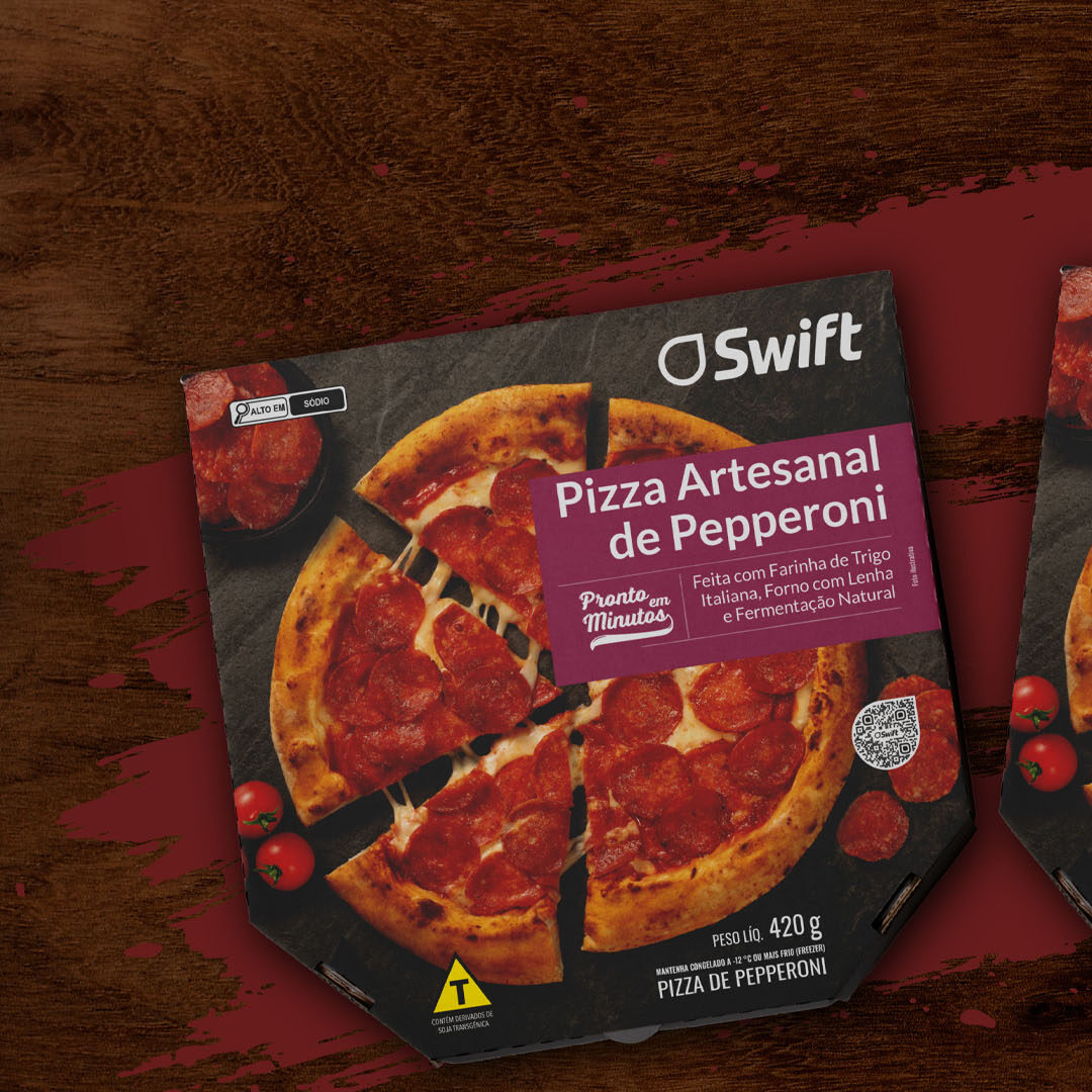No desenvolvimento da Pizza Artesanal Swift, nosso foco foi traduzir qualidade artesanal e praticidade em um design direto e apetitoso.