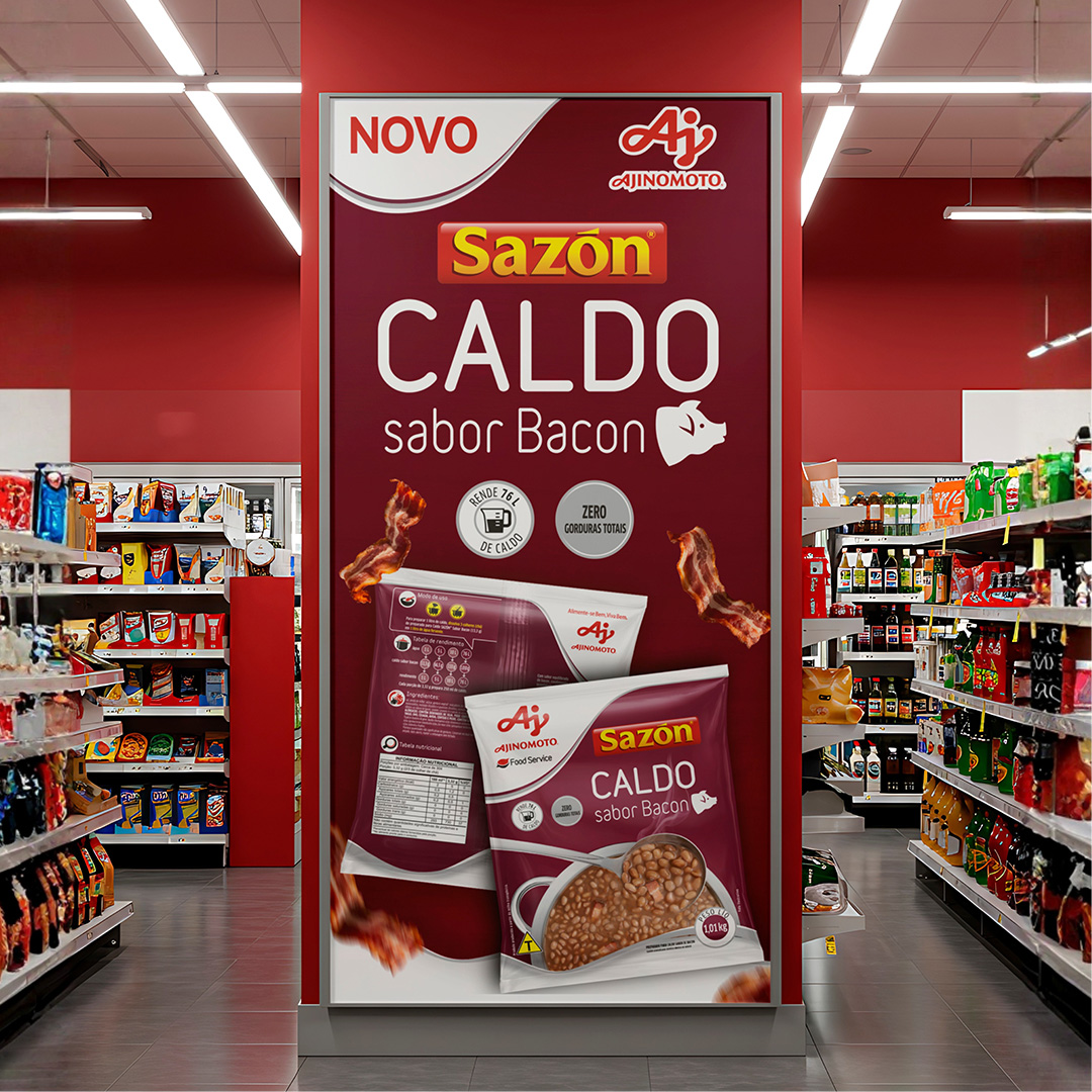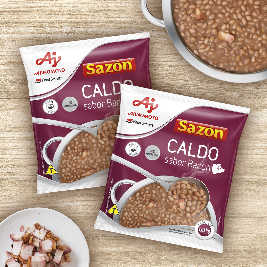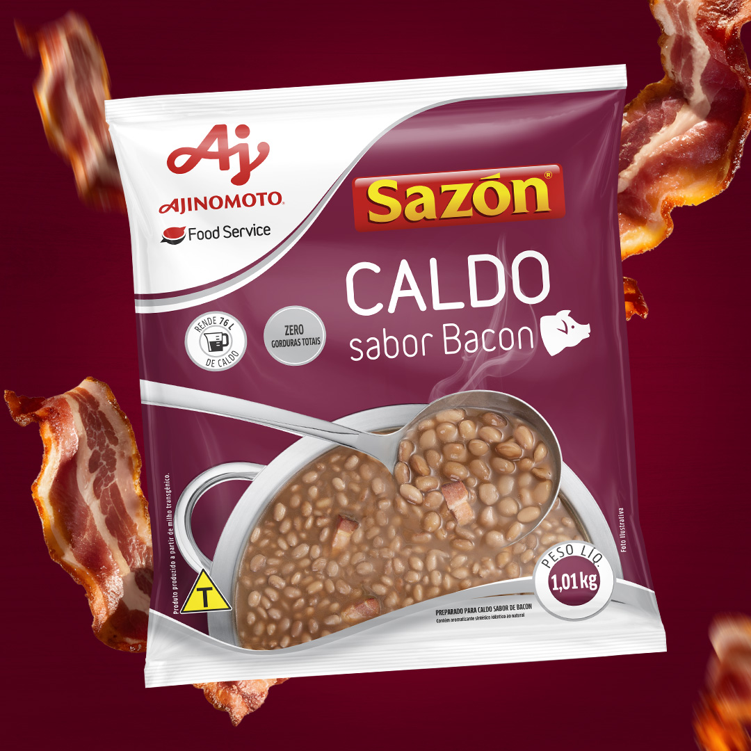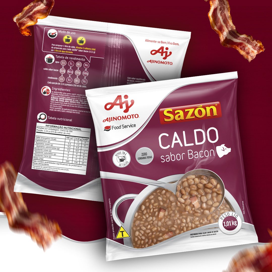 O novo Caldo Sazon Bacon chegou para complementar a linha institucional da marca, e a Spice teve o prazer de assinar a embalagem desse lançamento. Criamos uma identidade clara, com diferenciação de cor e propósito: facilitar o uso no dia a dia das grandes cozinhas, desde o armazenamento até o preparo.