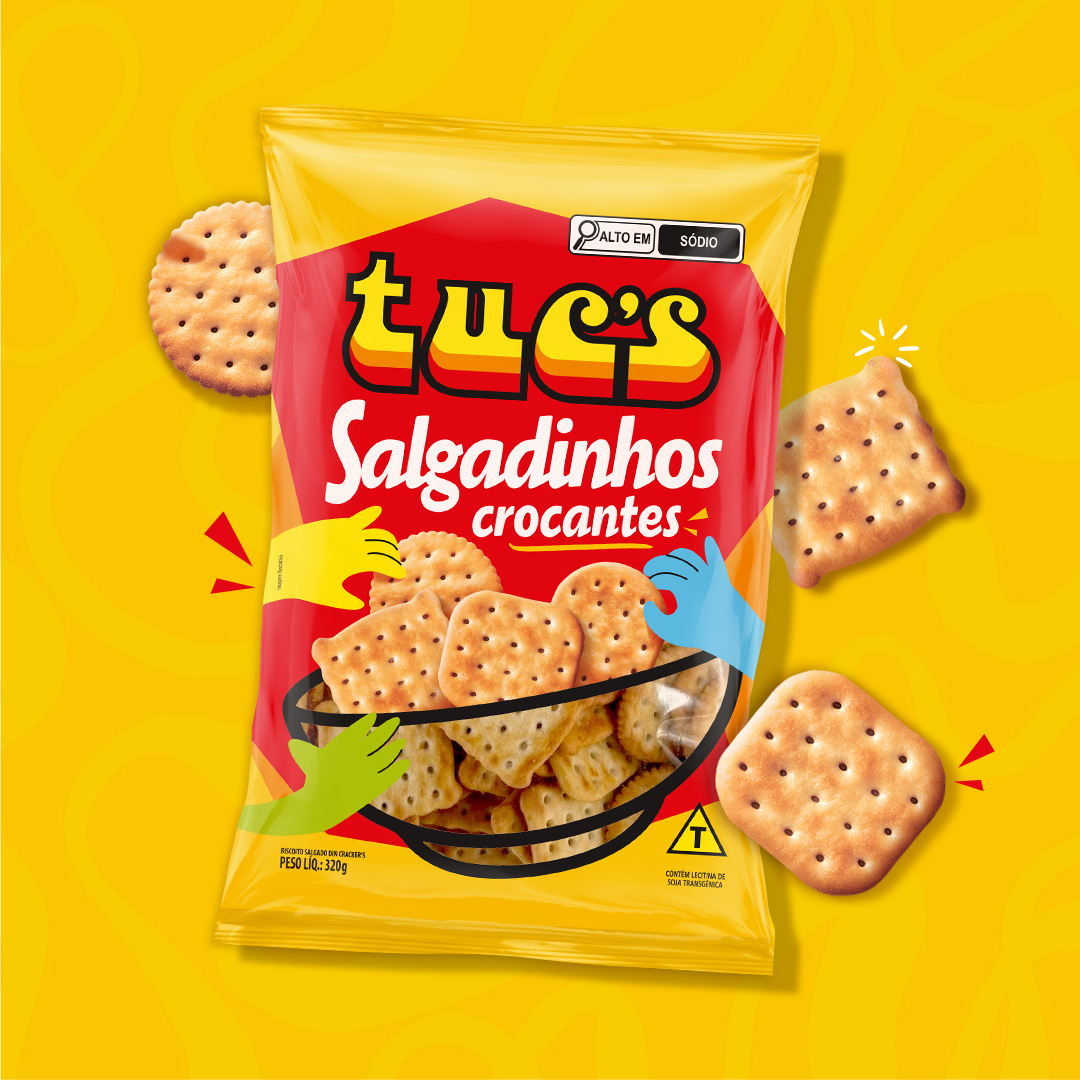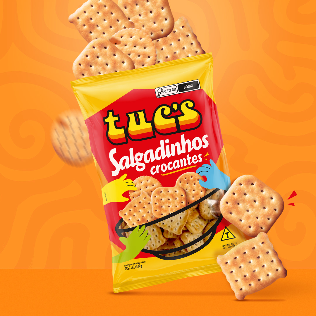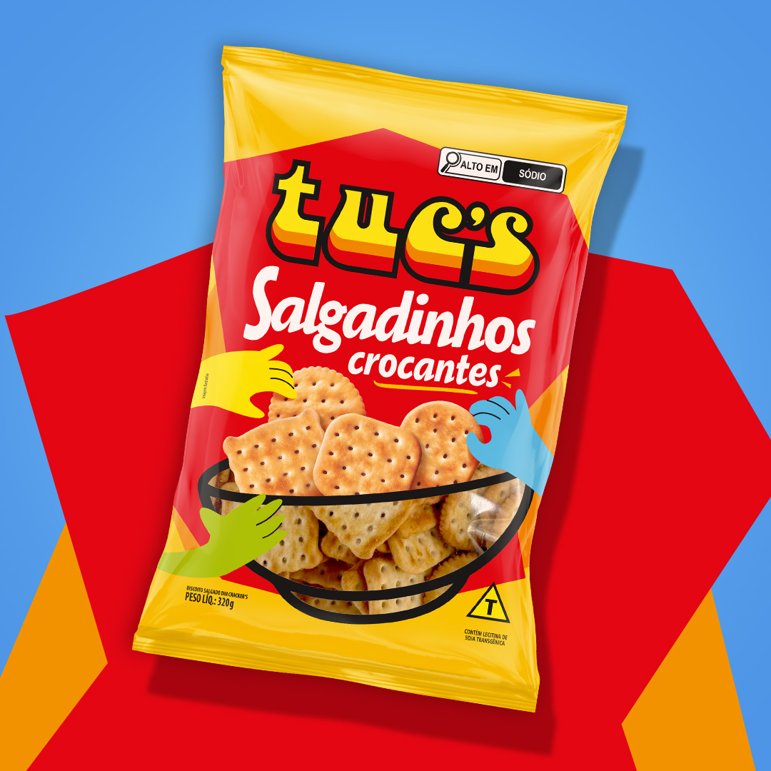 A Spice desenvolveu a identidade do Tuc’s Salgadinhos Crocantes, trazendo a energia divertida dos anos 80 e 90 para um visual vibrante, cheio de movimento e memória afetiva.